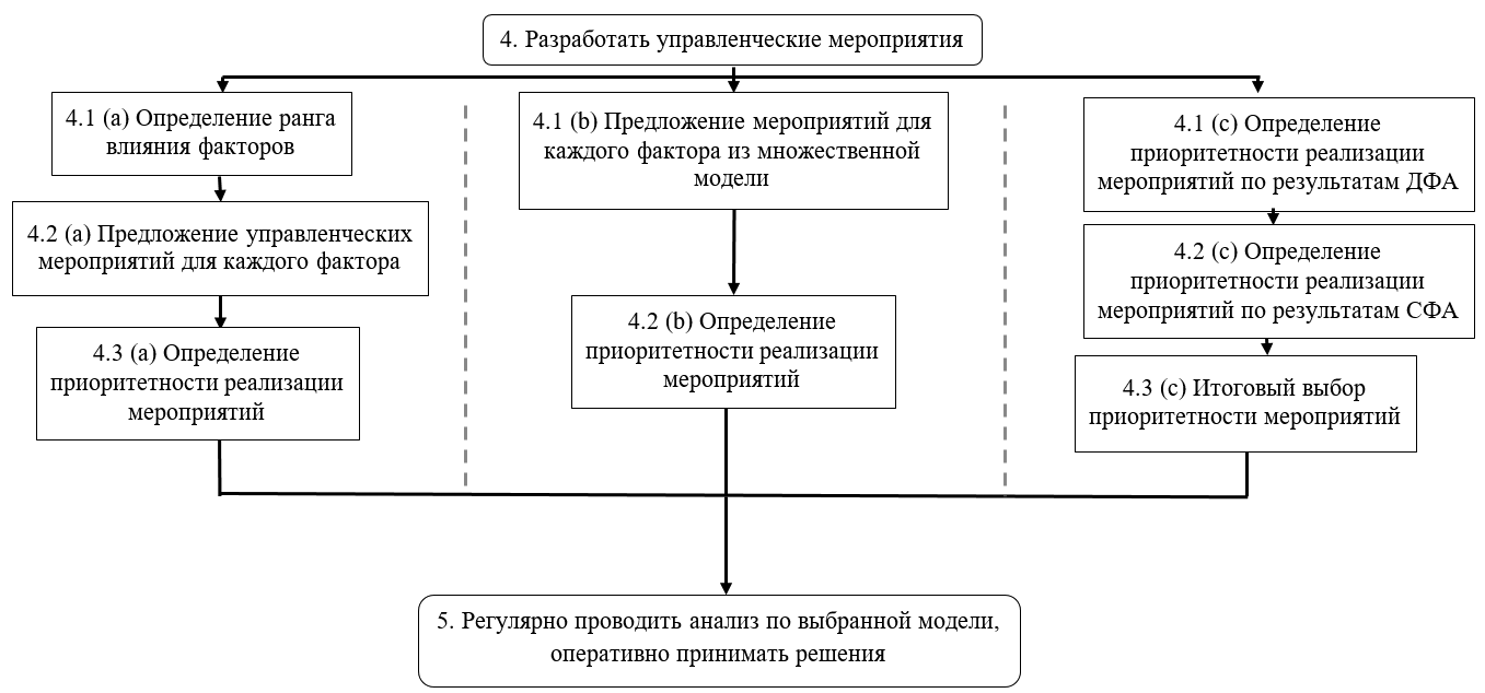Для повышения эффективности предприятий авторы предлагают использовать комплексный подход, интегрирующий детерминированный и стохастический анализ — два основных типа факторного анализа (Алтухова, 2013). Подход учитывает специфику различных ситуаций, обеспечивая целенаправленное воздействие на ключевые факторы. Он делится на последовательные этапы, позволяющие не только диагностировать проблемы, но и формировать управленческие решения для их разрешения.