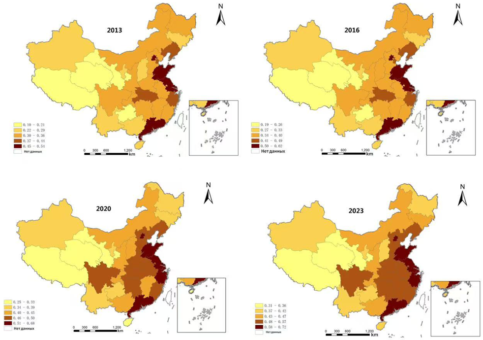 В период 2013—2023 гг. комплексный уровень развития новой урбанизации в Китае демонстрирует общую тенденцию к устойчивому росту, что свидетельствует о значительной эффективности стратегии, ориентированной на человека. Разрыв в развитии между провинциями остается существенным, межрегиональные различия формируют четкую градиентную структуру распределения: «восток лидирует, центр догоняет, запад отстает». Реализация дифференцированных региональных стратегий будет способствовать смягчению этой градиентной модели.