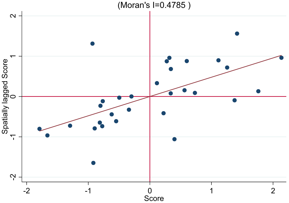 В течение всего исследуемого периода индекс Морана был положительным, и р-значения — значимыми на уровне 1 %. Это доказывает, что развитие новой урбанизации на провинциальном уровне в Китае не является случайным распределением, а демонстрирует положительную пространственную корреляцию. То есть провинции с более высоким уровнем урбанизации имеют тенденцию соседствовать с другими провинциями с высоким уровнем, а провинции с низким уровнем, как правило, окружены другими провинциями с низким уровнем.